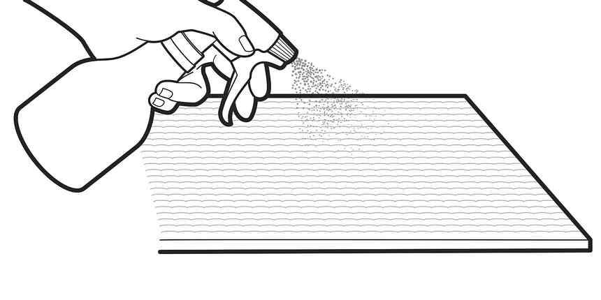 Spray the mat with a mixture of about 2 cups warm water and a few drops of mild dishwashing liquid.